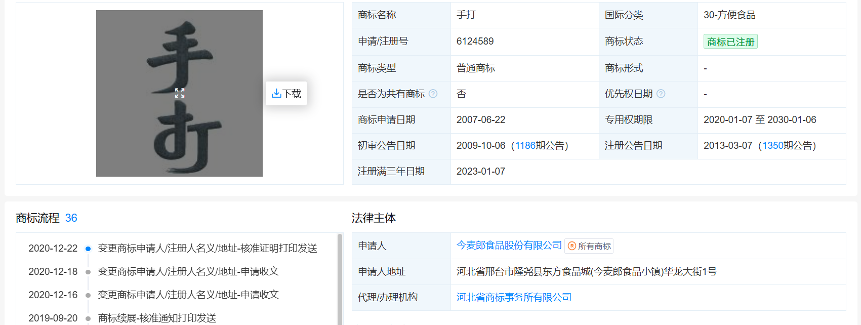 但随即今麦郎的“1袋半”“1桶半”便利面等产物又引争议。有网友发觉,“1袋半”“1桶半”左上角均有TM标记,正在贸易老例中常被用于表白正正在申请注册或未注册的商标。天眼查消息显示,今麦郎于2016年先后成功注册“1桶半”“1袋半”的两枚图形商标,该“1桶半”商标至今无效,但“1袋半”商标已于2022年8月被宣布无效。该商标无效案二审显示,商标“1袋半”审定利用正在“便利面”等商品上,相关基于一般认知,会将“1袋半”理解为系对商品分量的间接描述,凡是不会将其识别为商标,无法阐扬区分商品来历的感化。因而,诉争商标审定利用正在“便利面”等商品上缺乏应有的显著特征,不具备可注册性。